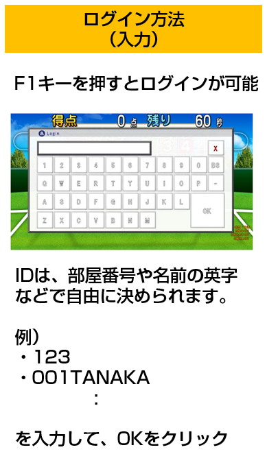 IDは、事前に登録する必要はなく、F1キーを押すとID入力ができます。