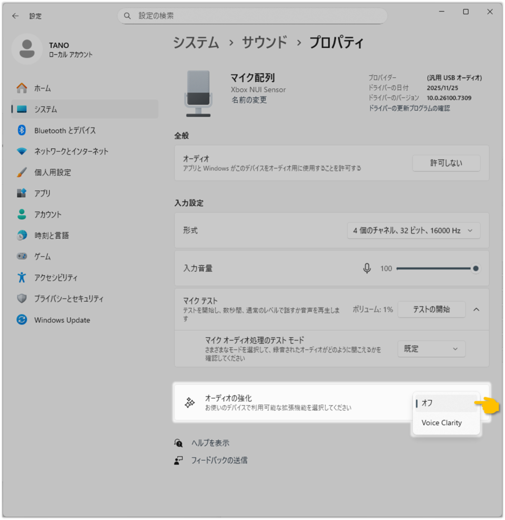 2. 「入力」下の「マイク配列 Xbox NUI Sensor」を選択します。