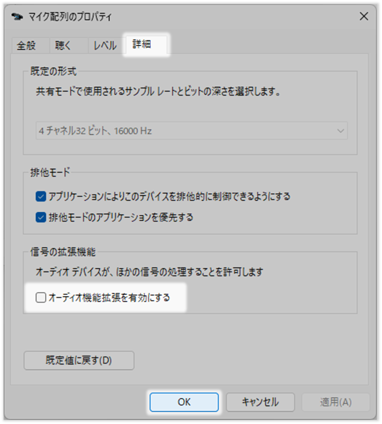 1. 「詳細」タブを選択し、「信号の拡張機能」グループの「オーディオ機能拡張を有効にする」チェックボックスをオフにします。